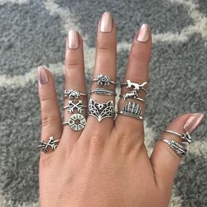 Brand new with tags 12-piece Zodiac Silver Ring Set. Zinc alloy. Rings have an intentional "distressed" look to fit the boho style, and not all rings are round but may be more oval shaped to accommodate wider widths.