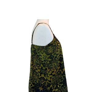 This top has a beautiful exotic pattern with a metal sowed-in piece on the front neckline area.