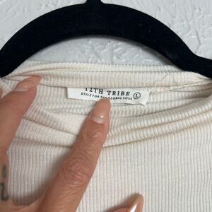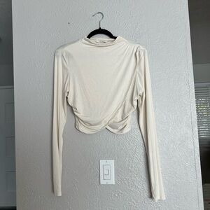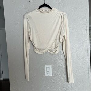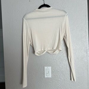 Elegant cream crop top. Long sleeves with a stylish twist front. Perfect for casual or chic looks.