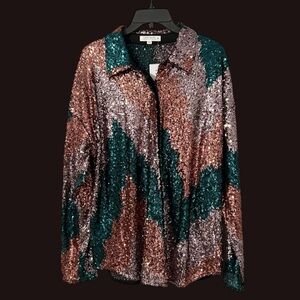 12th Tribe Genevieve Emerald Sequin Button-Up Shirt • Size Medium Top • NEW with Tags! • As Seen On TikTok • Oversized • Exotic • Luxury