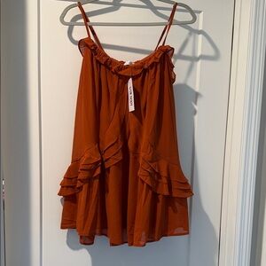 Stylish rust mini dress with playful ruffles. Perfect for a night out.