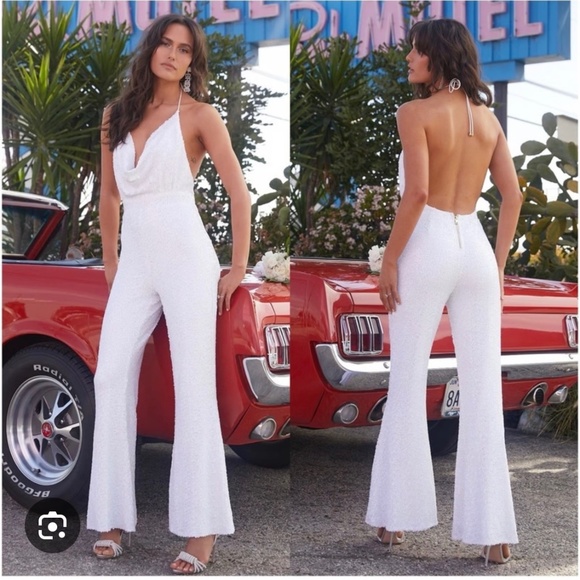 White sequin jumpsuit, halter neck with cowlick. Size small. Thick material and comfortable to wear. Worn once but dry cleaned and in excellent condition. Perfect for a bachelorette or bridal shower!