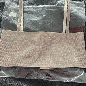 Shimmering silver crop top. Features a stylish strap design. Perfect for a night out.