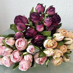 These 12-head rose bouquets are gorgeous. They are perfect to display by themselves or to place in a mixed arrangement (they can be separated into 6 individual stems). They feature 12 buds; beautiful and realistic. There are two sizes of buds (6 of each size), with the larger size being more "in bloom". The smaller bloom measures approx. 1 1/2"L x 1 1/8"W. The larger size measures approx. 1 3/4"L x 1 1/2"W.