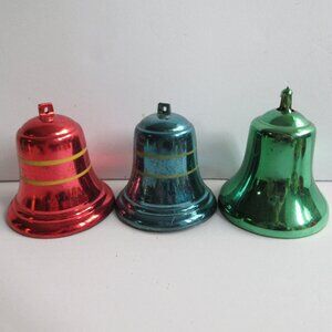 2 Striped bells, red and blue, one solid red, one solid green, one solid blue