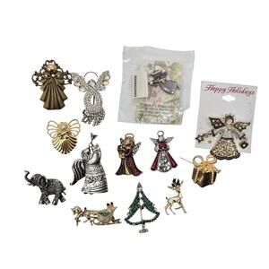 Collection of 13 Decorative Pins featuring charming Christmas, angel, and elephant designs. This assorted lot includes enamel and rhinestone embellishments, adding sparkle and festive flair to any outfit or display. Perfect for collectors, crafters, or holiday gifting. Gently pre-owned condition with beautiful detail and variety—great mix of vintage and contemporary styles.