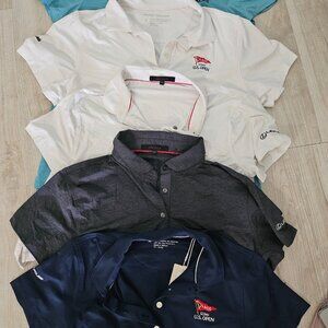 These are ladies golf shirts I got from various golf tournaments and events. Many have the Lexus logo or Golf tournament logo and a few have no logo at all. The lot consists of golf shirts in well-known brands like Nike (Dry-Fit), Puma, FJ, Greyson, and Peter Millar. All are brand new without tags. Most of the shirts are Medium and there are a couple that are Large. This is being sold as a lot that includes all 13 shirts. See photos for colors and styles.