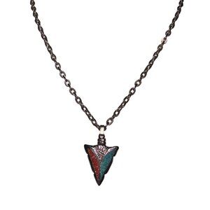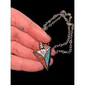 Interesting metal shark tooth necklace with what looks like two stone pieces. One stone is blue and the other is red. Unbranded.