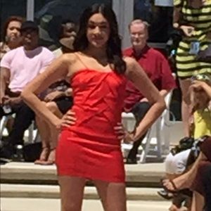 Red Dress: This red thin spaghetti strap dress has a pleated criscross front and beading detail. Large measurement: bust 39-41; waist 29-32; hips 39-42. 97% polyester 3% Spandex
