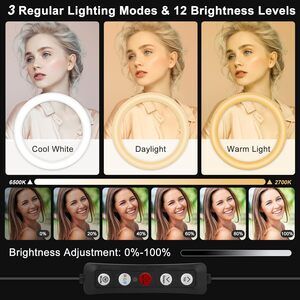 Vlogging Ring light offers 3 regular lighting modes: warm light (2700K), daylight (4500K), and cool white (6500K), along with 12 different brightness levels to choose from. You can easily control all of these functions using either the included line controller or remote control. It distributes light evenly without shadows or glare, helping to minimize blemishes and create the perfect lighting for your content creation needs. Choose our Ring lights for flawless lighting that's easy to control.