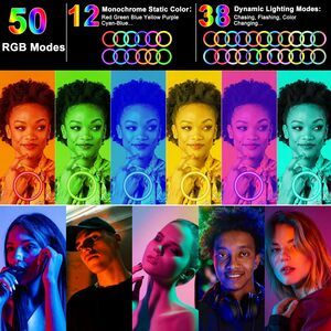 50 RGB Lighting Modes: Our ringlight offers impressive 50 RGB lighting modes, allowing you to choose from static colors such as red, green, yellow, blue, purple, and more dynamic color-changing options. You can easily adjust the speed of the light using the Up and Down keys. These vivid lighting effects offer a fun and creative way to enhance your photography, letting you experiment with different moods and aesthetics.