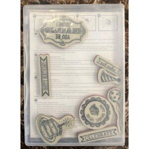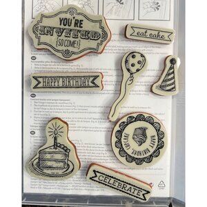 A versatile set of rubber and acrylic stamps featuring birthday-themed designs. Ideal for creating personalized cards, scrapbook pages, and party invitations.