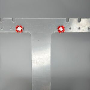 Each earring features five white enamel petals surrounding a central cluster of rhinestones and a faux pearl. The earrings have post backs and are approximately 1.5 inches in diameter.