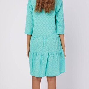 This Alcee summer blue turquoise dress is a luxurious staple for summer days or nights. With its relaxed fit, collared neck, subtle pom pom trim on the sleeves and soft cotton material, it is sure to become a go-to in any wardrobe. Crafted with fine detail and an eye for quality, this timeless piece is perfect for a sophisticated and exclusive look.