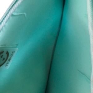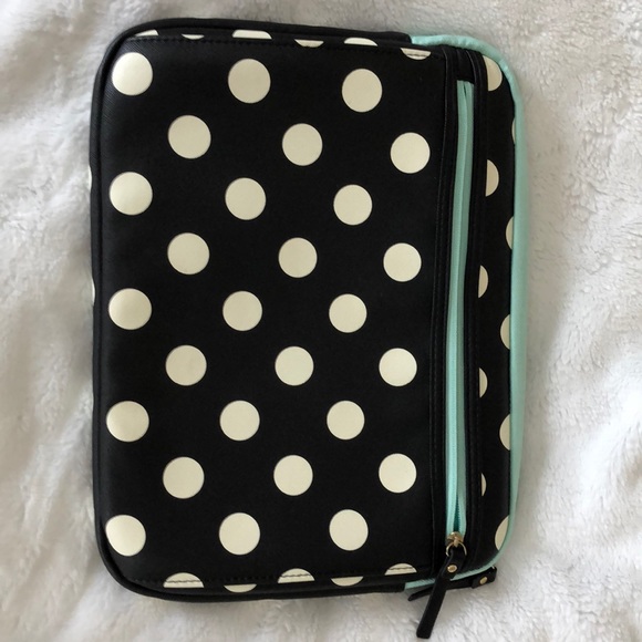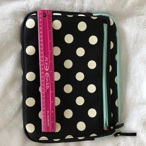 Black with white polka dots with teal inside and zipper. Has a large front pocket with zipper.
