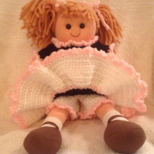 13.75" Cotton rag doll(doll is NOT handmade) with handmade crocheted Black and white dress with pink trim and matching bloomers...100% polyester filled. ..She has sandy color hair. Her pig tails are tied with pink crocheted ties....she wears brown shoes and white socks...they are attached and don't come off, they're part of the doll... If you have any questions, please contact me. Doll also available with blonde hair..