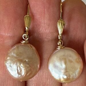 13.7mm NATURAL Color Coin Pearl 14K Yellow Gold Filled Leverback Earrings