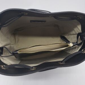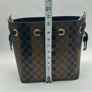 Drawstring closure. Goldtone hardware.