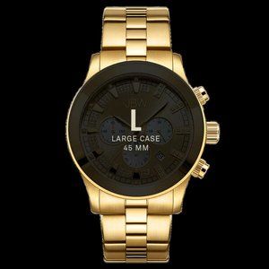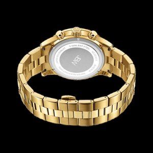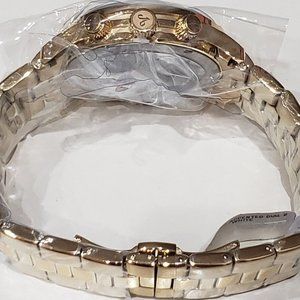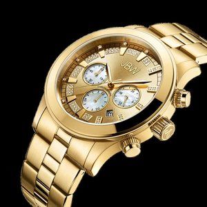 Yellow gold-tone stainless steel case and bracelet. Fixed yellow gold-tone bezel. Yellow gold sunray (diamond-set) dial with yellow gold-tone hands and diamond-tipped index markers hour markers. Minute markers around the outer rim. Dial Type: Analog. Date display between the 4 and 5 o'clock positions. Chronograph - three sub-dials displaying: 60 second, 60 minute and 24 hour. Hattori caliber VD53 quartz movement. Scratch resistant mineral crystal. Pull / push crown. Solid case back. Round case shape. Case size: 45 mm. Case thickness: 14.5 mm. Band width: 22 mm. Band length: 8.5 inches. Fold over clasp with a push button release. Water resistant at 50 meters / 165 feet. Functions: chronograph, date, hour, minute, second. Delano Series. Dress watch style. Item Variations: 6218 E, 6218.E, 6218E. JBW Delano Chronograph Diamond Dial Men's Watch JB-6218-E.