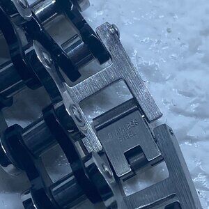 ** Crafted from durable stainless steel, this 13MM motorcycle biker chain bracelet boasts a striking silver and black finish. Featuring a secure clasp, it's available in two sizes for a comfortable, sleek fit.