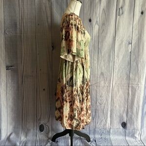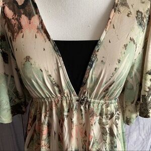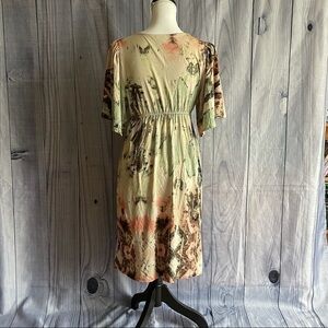 This dress is in good condition with normal signs of wear. It has an elastic waist and a v-neck. It is 96% polyester and 4% spandex and is machine washable. Great looking dress for that mother to be.