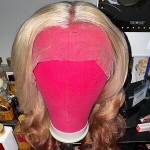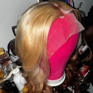 Lace uncut, semi plucked, toned and colored, 24in with light layers, adjustable band and hair clips attached, 180% density (fuller up top, thinner towards the ends) body wave. Lace band, lashes & edge brush included