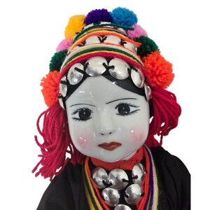 This ethnic doll features vibrant colors and intricate embroidery, representing cultural artistry. Its detailed pom-pom headdress and traditional outfit make it a unique collectible.