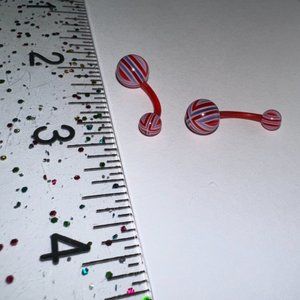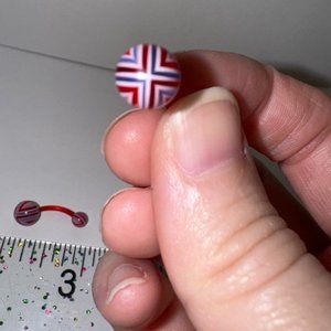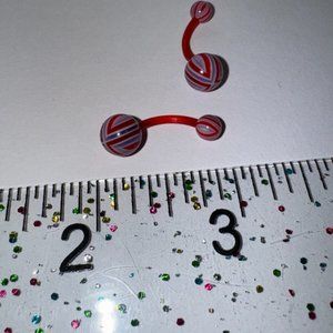 This belly ring is 14 gauge and is made out of uv acrylic. This is a flexible barbell w/a larger ball on the bottom that measure 7.96mm and a smaller ball on the top that measure 5.10mm. You can use this 14 gauge piece of jewelry as a belly/navel ring or as a nipple ring if you prefer a curved ball. I also have other 5mm round balls if you want to buy replacements so you can have 2 of the same size ball for something like a nipple piercing.
