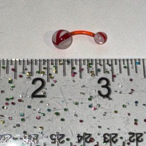 This belly ring is 14 gauge and is made out of uv acrylic. This is a flexible barbell with a larger ball on the bottom that measure 7.96mm and a smaller ball on the top that measure 5.10mm. You can use this 14 gauge piece of jewelry as a belly/navel ring or as a nipple ring if you prefer a curved ball. I also have other 5mm round balls if you want to buy replacements so you can have 2 of the same size ball for something like a nipple piercing.