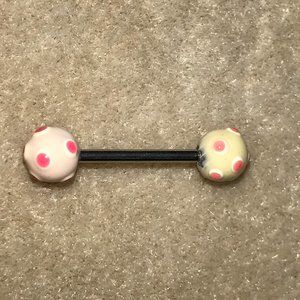 14 Gauge White and pink polka dot design Tongue Ring. The balls on this tongue ring are ceramic.