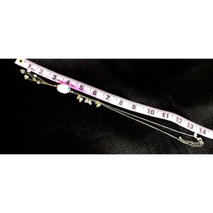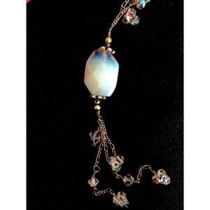 14 Inch Gold Tone Milk Glass and Aurora Borealis Crystal Beaded Vintage Style Necklace by Lia SophiaThis lovely gold tone necklace is 14 inches long, from the clasp, to the bottom of the decorative crystal beads. It features a large milk glass center stone, with three smaller, dangling aurora borealis crystal beads spaced up either side of the chain. More of these gorgeous crystal beads dangle on the filigreed chain below the center stone, giving the piece an elegant, classy finish. By Lia Sophia.