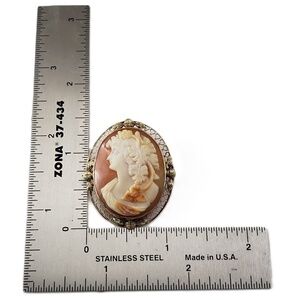 This timeless cameo features a delicately carved lady in profile, combining classic elegance with intricate craftsmanship. This stunning piece is framed by an exquisite filigree setting in 14K yellow gold. Can be worn as a brooch or a pendant.