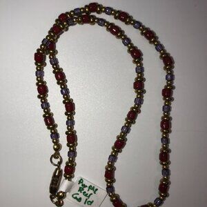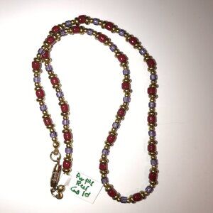 14" long beaded necklace with red and purple and gold tone beads with a twist closure. There are a variety of 3mm round gold tone beads, 4mm round roundel gold tone beads, red seed beads, and purple clear seed beads. The closure is a gold tone twist closure.