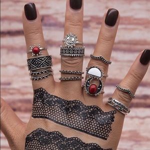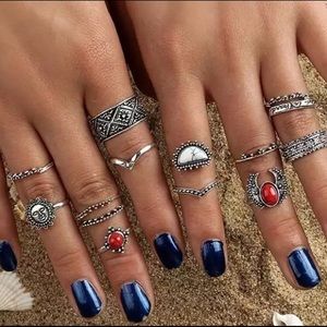 14 PIECES TURKISH BOHEMIAN RING SET, SIZE RANGE 4 3/4-7. WEAR ON ANY FINGER ABOVE OR BELOW THE KNUCKLE/ RUSTIC LOOK TIBETAN SILVER (ALLOY METAL), RED AND WHITE GEOMETRIC FAUX TURQUOISE STONES, CARVED SUN, CHIC HIPPIE TURKISH BOHO PARTY FUN RING SET, SHOW OFF THOSE PRETTY NAILS! NEW, CHECK OUT MY OTHER LISTINGS, ASK ME TO BUNDLE AND SAVE ON SHIPPING CHARGES!