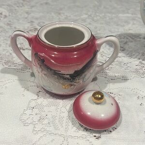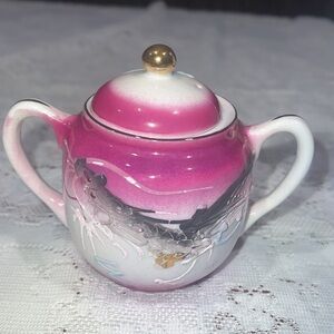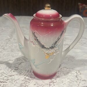 This is a beautiful 14 Piece Set Pink Black White Handpainted Moriage Dragonware Tea Espresso Set. Tall tea pot 7” with top, sugar pot with top, creamer, 6 saucers and 5 cups. Each cup is 2.25” tall.