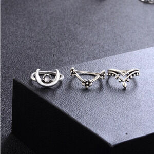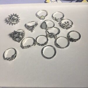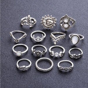 14 piece boho trendy knuckle ring set. Faux opal in select rings. Celestial, gypsy, and floral themed. Ring sizes vary from 5 to 7.5 (specific ring sizes are shown in the pictures), and are sold as a set (cannot be separated). Material is a silver toned zinc alloy. Keep dry and away from oils and lotions.