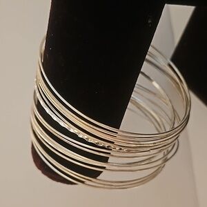 14 Silvertone Bangle Bracelet Lot. These are in good shape, but do have some tarnishing on some of them as seen in pictures.