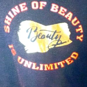This is a black sweatshirt hoodie. It has a shiny foil gold and red logo that says "Shine of Beauty is Unlimited" on the front left side. This is cotton polyester in great condition. Stretches in all directions and thick fabric.