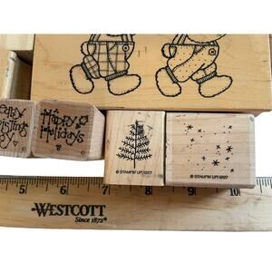 3 Christmas stamps; 2 snowman stamps; 4 with sayings Merry Christmas, Seasons Greetings, Beary Christmas Joy, Happy Holidays; 2 trees, snow flake; starts and 2 christmas bears