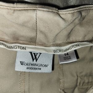 The product is a pair of Worthington women's khaki pants in size 14, with a 35in waist measurement, featuring a modern fit and capri length with a 25-inch inseam. They have button details on the cuff hem and front belt loops that connect front pockets for added detailing. The closure includes a zip, button, and slide button for extra security and comfort. Made from a blend of spandex, polyester, and cotton, these khaki pants/slacks offer a comfortable and stylish option for everyday wear. Excellent condition!