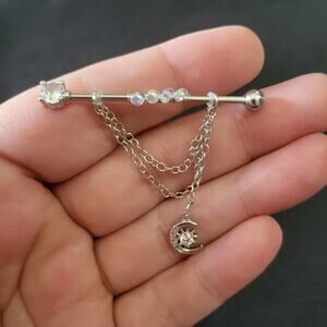 14 gauge stainless steel industrial ear piercing, beaded with crystal moon & sun