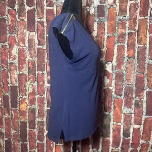 Chic navy blue Michael Michael Kors top featuring gold-tone zipper details on the shoulders and a rhinestone logo accent at the hem.