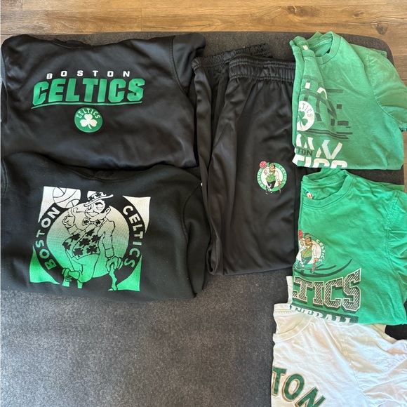 Celtics clothing lot. All tags pictured, but I’ll fit my son when he was wearing size 14/16z. Top black hoodie has some paint on one arm that is pictured the rest. I don’t see anything major..
