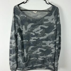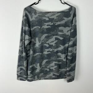 Used 1.4.3. Story By Line Up Wide Neck Sweater. This is missing its size tag, but I believe it is a women's medium. Green and grey camo pattern throughout. **Put this as used due to some missing thread around the neck, missing size/care tag, and it is somewhat pilly. See pics**. Still wearable as is in my opinion! Incredibly soft and lightweight.