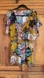 Beautiful Mustard Background with Blue Lavender Purple Flowers. Short sleeve, gathered waist, V neck.