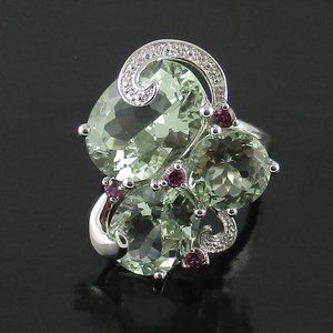 14.45ct Prasiolite & Garnet Sterling Silver "European" Ring. Three stone cluster of prong-set round and oval Green Prasiolite stones are accented by prong-set round Garnets. Swirl-shaped metalwork with bead texture. Open gallery, split shoulders.