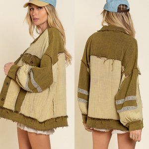 Balloon sleeve with lace trim and anoversized fit. Featured in double gauze and textured woven fabrics.