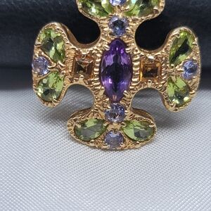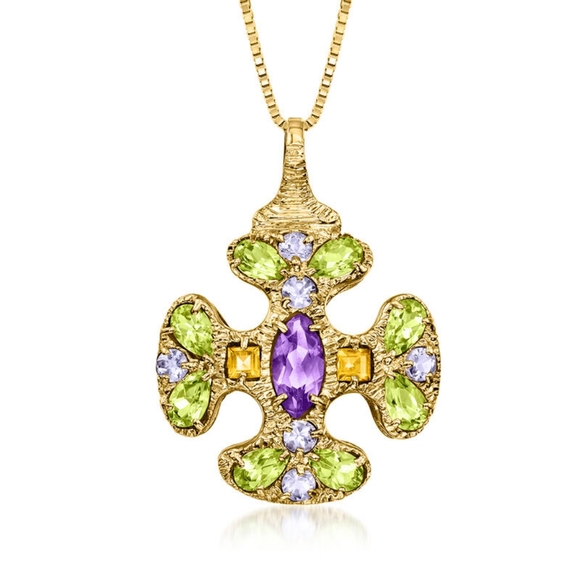 C. 1980 Vintage 3.00 ct. t.w. Multi-Gemstone Cross Pendant Necklace in 14kt Yellow Gold