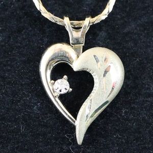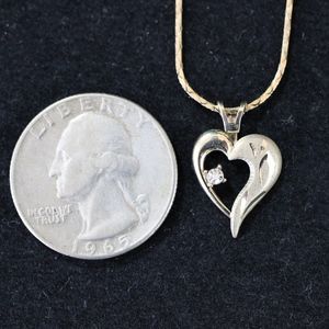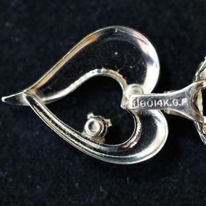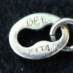 14KGF heart weighs 0.8 grams with a tested authentic diamond. Bale is stamped with a makers mark “dec” & “14KGF” quality stamp. Chain weighs 2.3 grams & is 18” in length. Chain is stamped markers mark of “DEL” & quality stamp of “14KGF”. Chain design called Cardano chain.