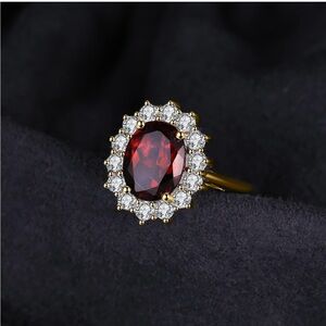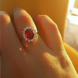 This stunning gold ring features a vibrant red garnet gemstone surrounded by sparkling accents. Perfect for adding a touch of elegance to any outfit.